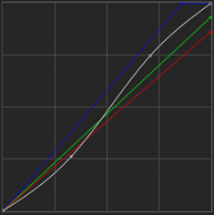 Below is the curves diagram. You can see that we darkened the green and red, then we moved the blue closer to our left-up corner to make it more nuanced in our footage.
